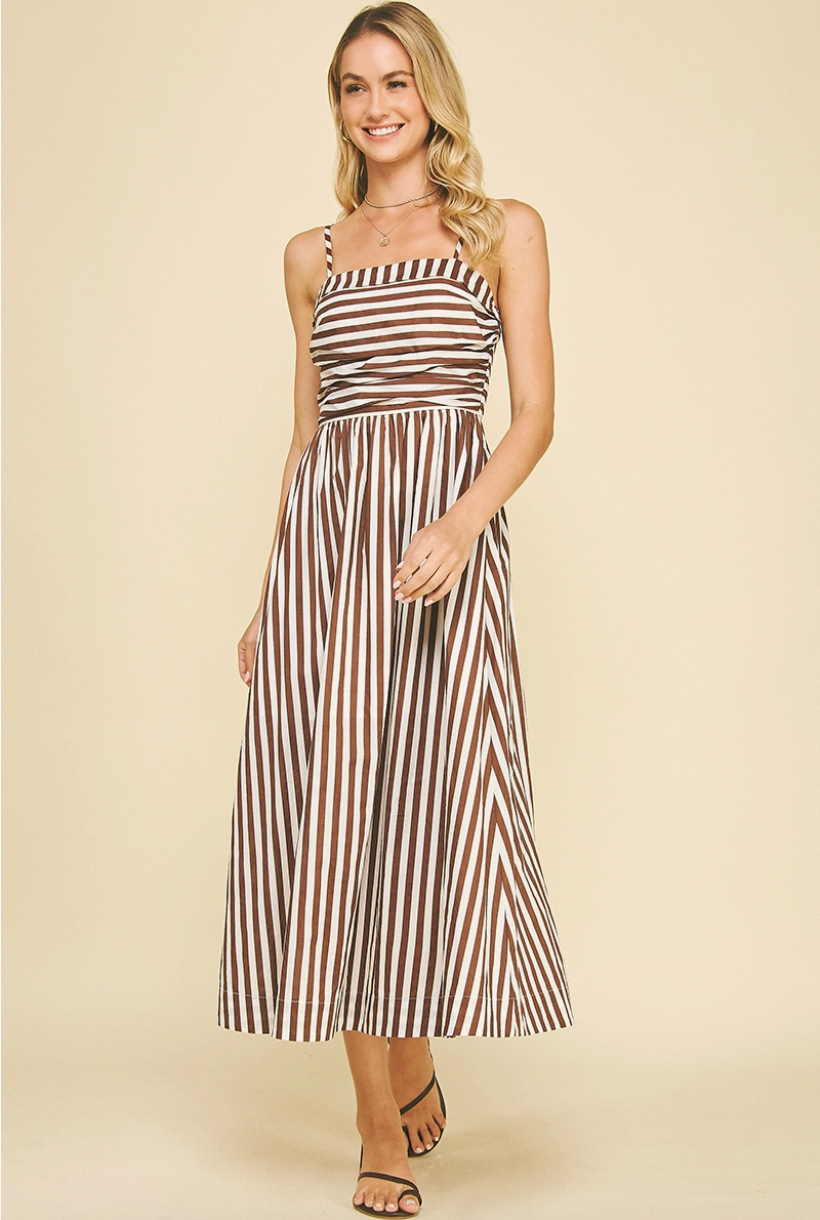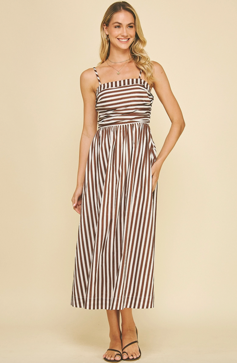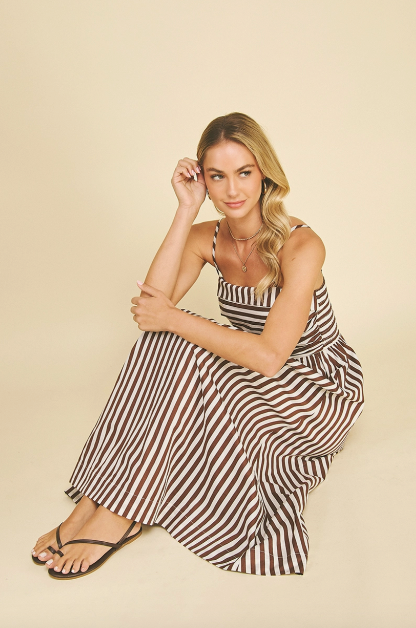 The Chocolate & White Striped Midi Dress is a timeless piece that blends comfort and sophistication with ease. The rich, neutral tones and classic stripe pattern create a polished look that's versatile enough for everything from weekend brunches to garden parties. With a flattering midi length and adjustable straps, this dress was made for warm days and golden hour moments.