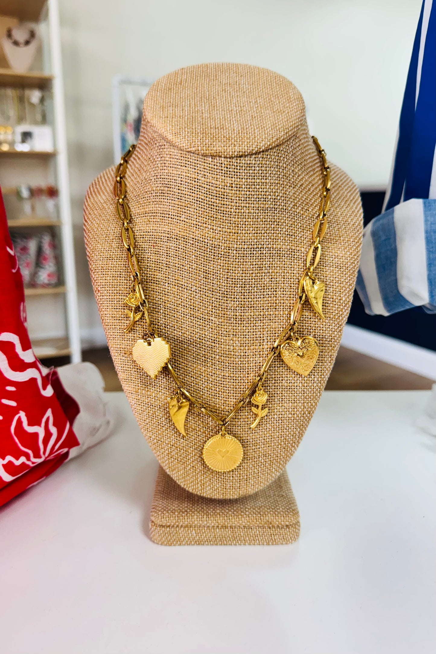Fall in love with the Gold Charm Necklace featuring five unique heart charms and two delicate gold roses. A bold yet wearable statement piece, this necklace blends playful romance with timeless shine. Whether worn solo or layered with your favorite chains, it’s a golden touch of charm you’ll want to wear every day.