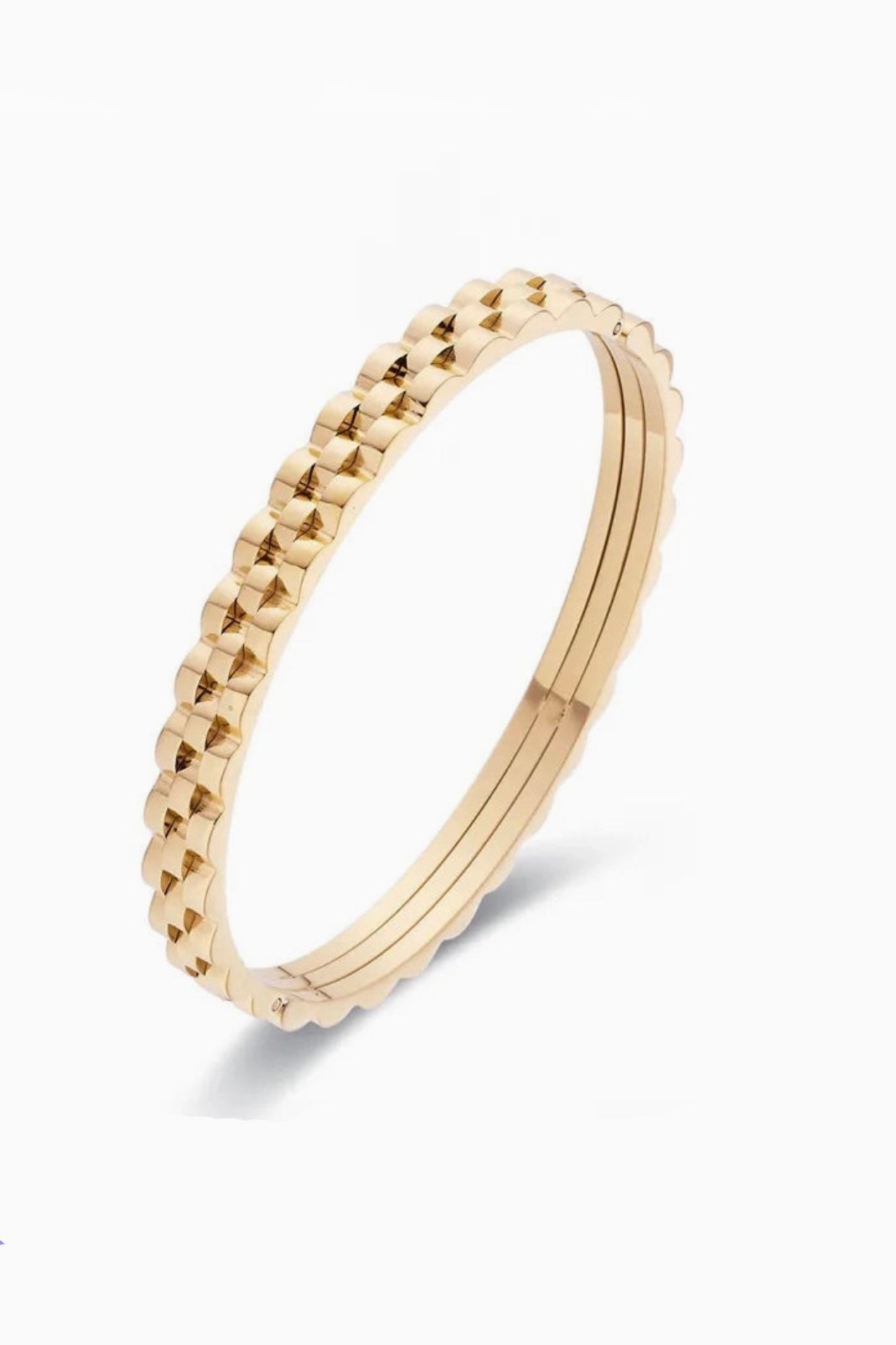 The Gold Watch Band Bangle delivers vintage-inspired elegance with a bold twist. Designed to mimic the look of a classic timepiece strap—minus the clock—this bracelet adds sleek structure and shine to any wrist stack. It's a head-turning conversation starter you’ll reach for daily.