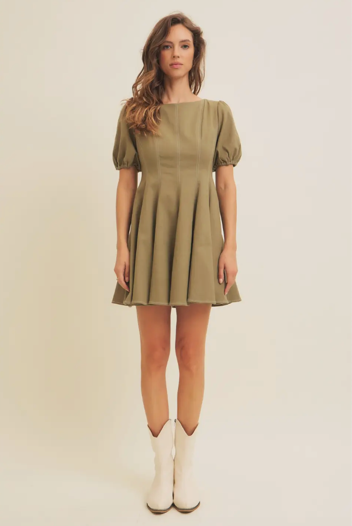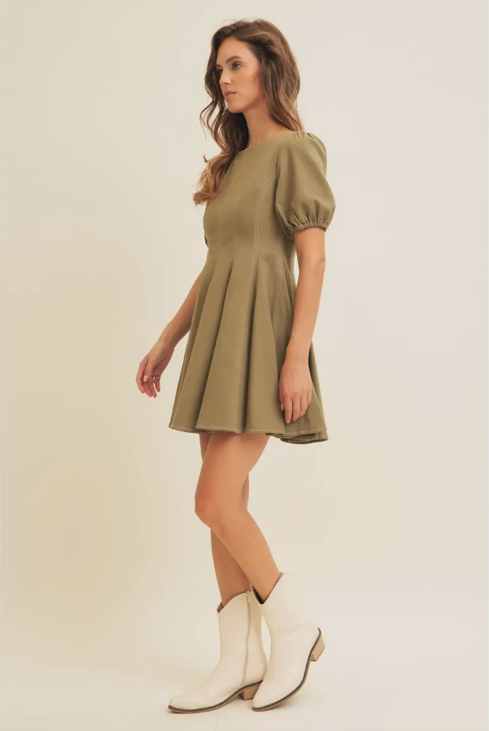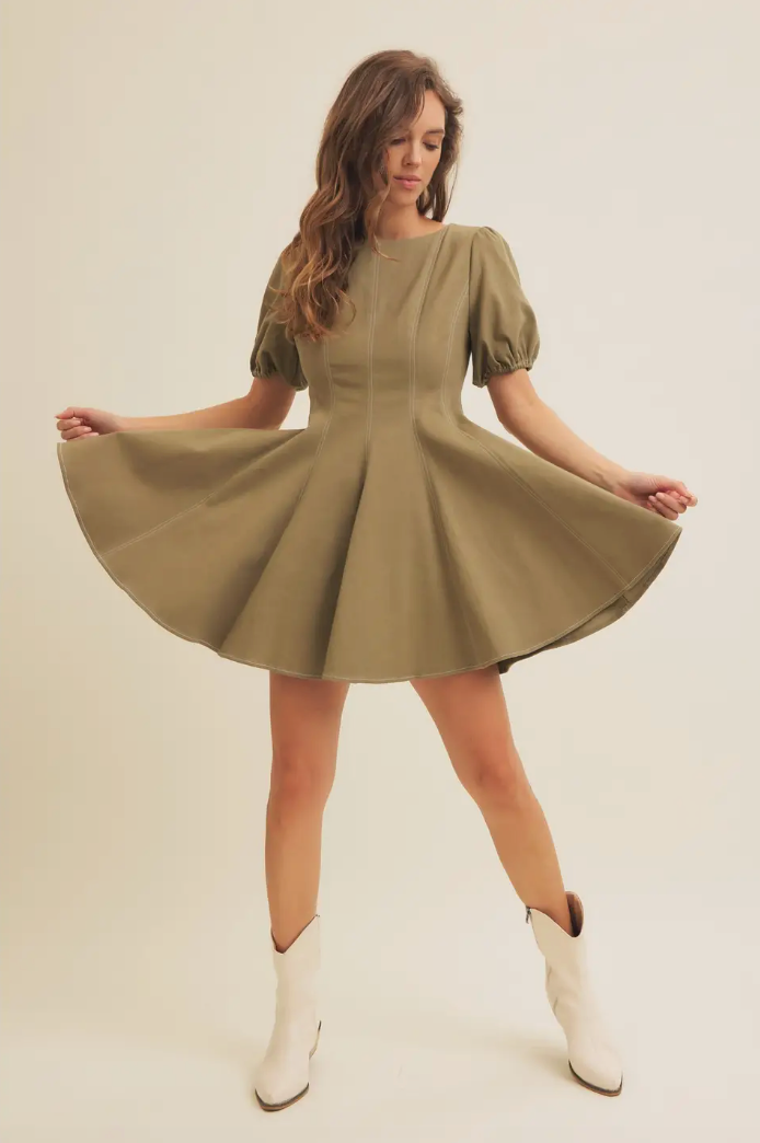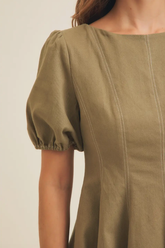 Olive Puff Sleeve Cotton Twill Mini Dress