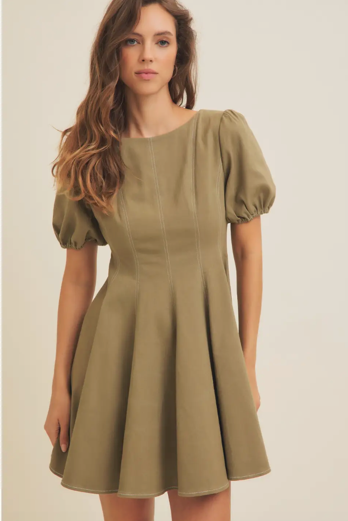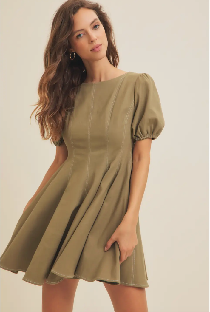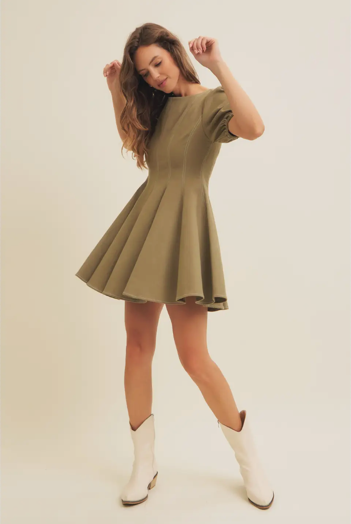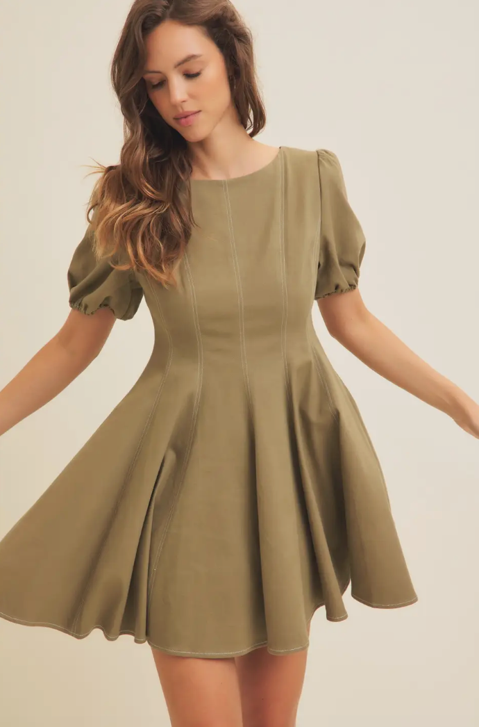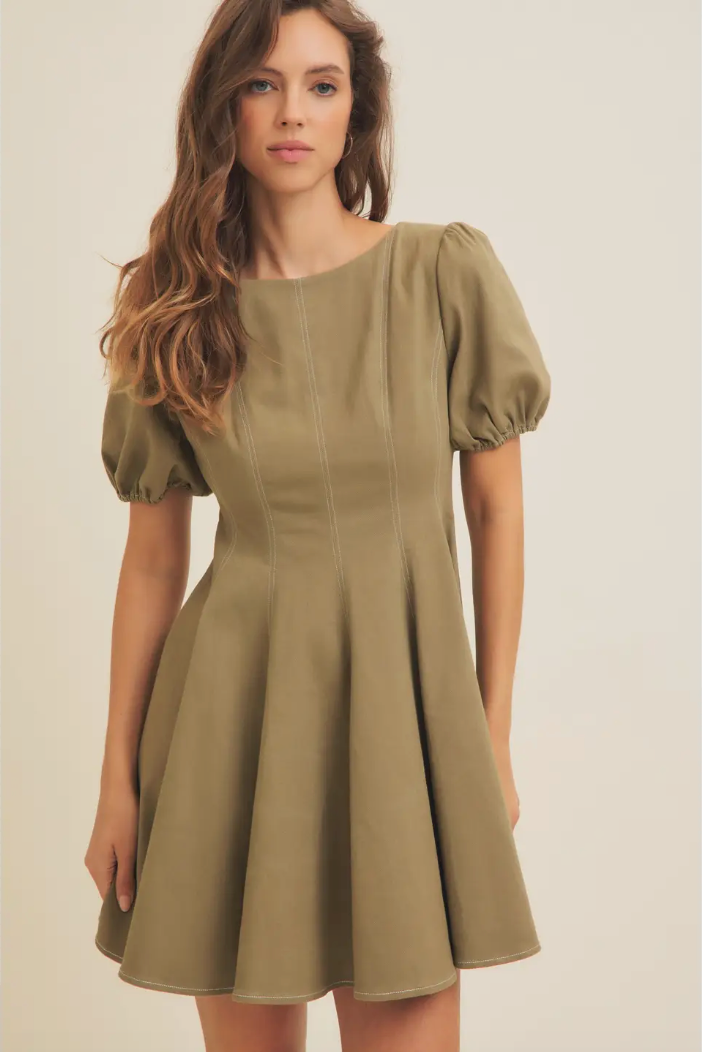 Olive Puff Sleeve Cotton Twill Mini Dress