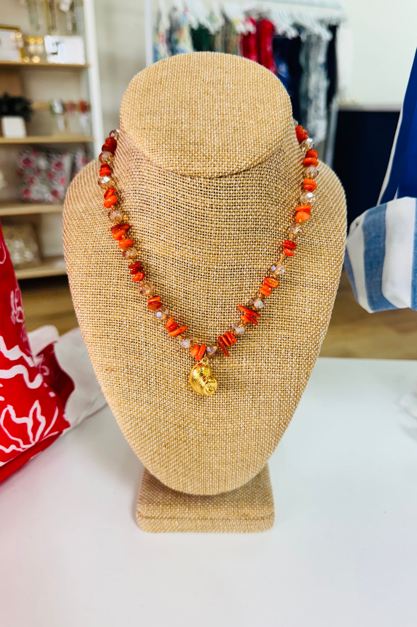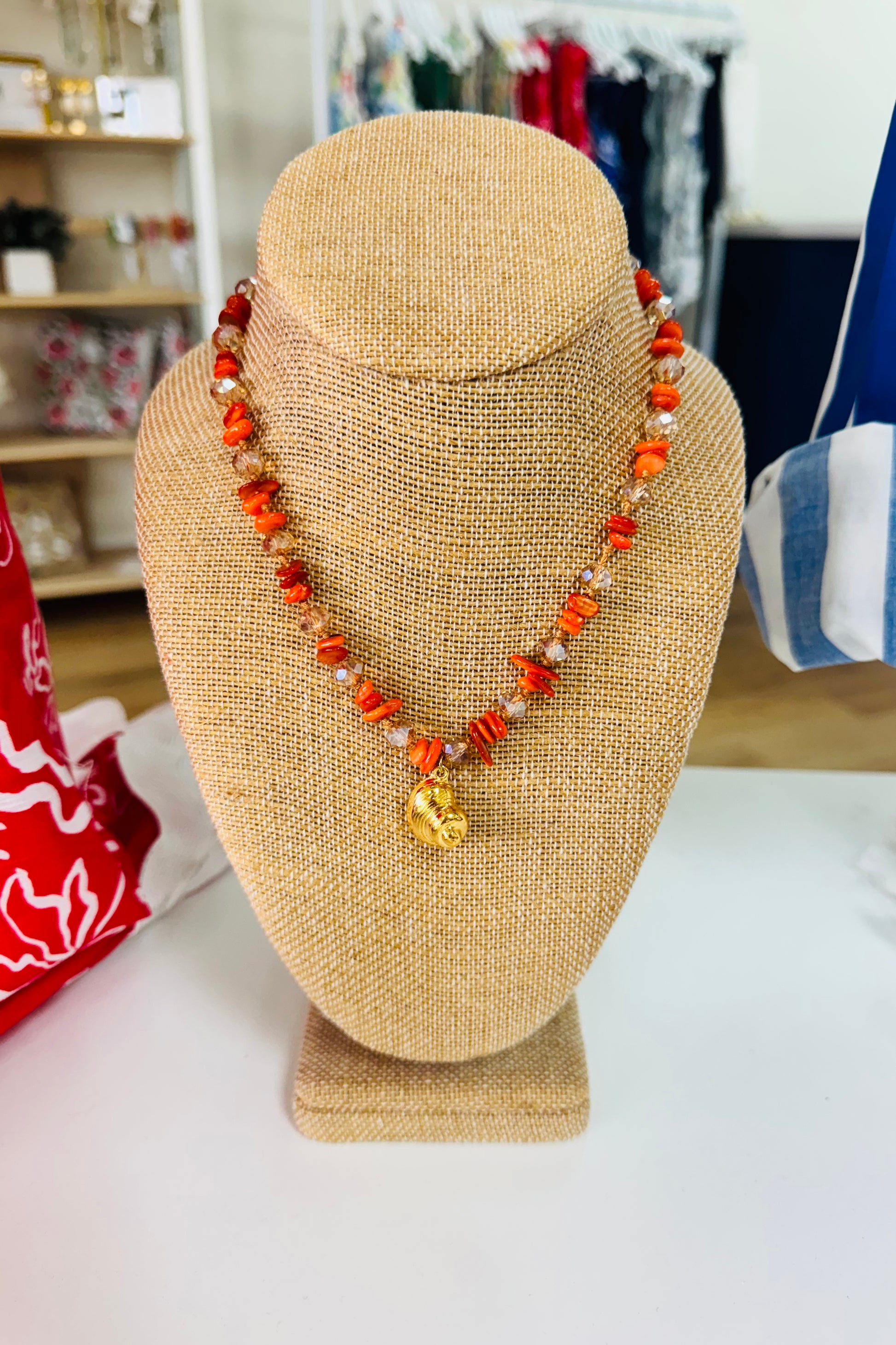- Handmade orange beaded necklace with gold shell charm