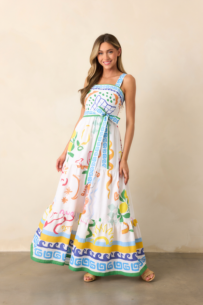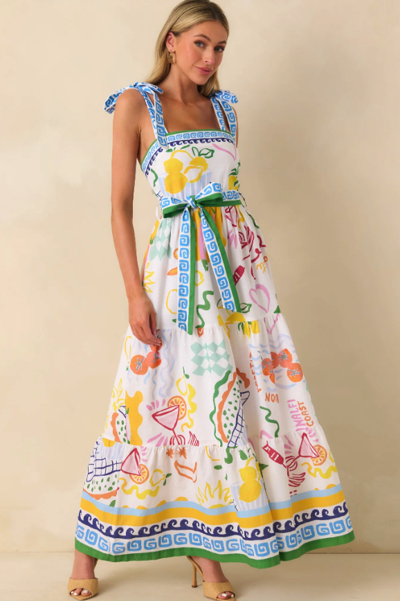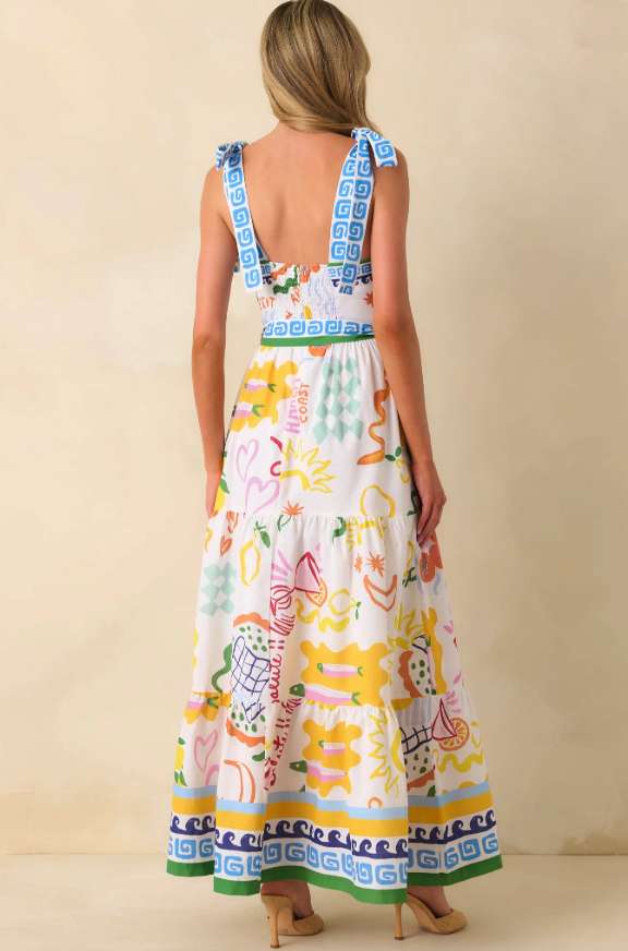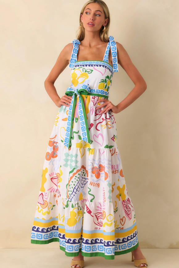 Bring the essence of a coastal getaway to your wardrobe with the Summer Spritz Gemma Maxi Dress by Prosperina. Featuring a bright and fun Mediterranean-inspired print, this dress instantly transports you to sun-drenched piazzas and seaside strolls. The vibrant palette paired with a classic silhouette creates a statement look that's as wearable as it is whimsical.