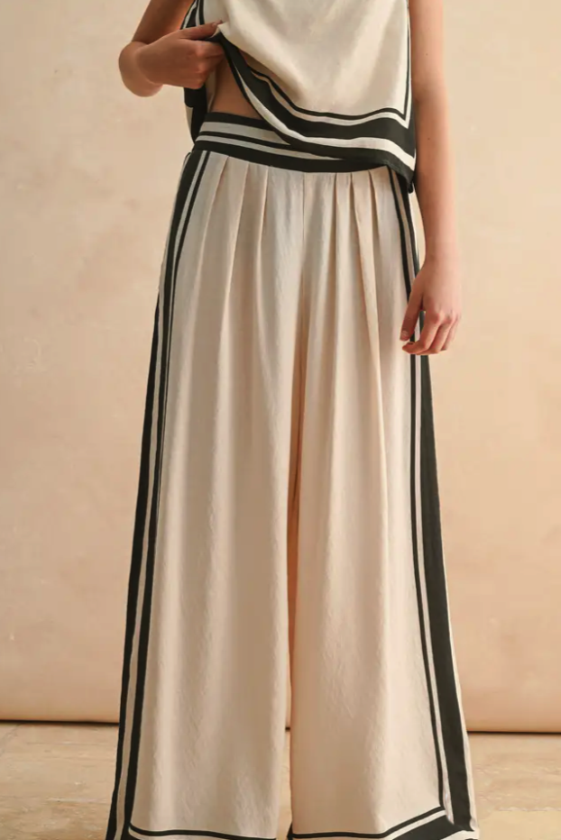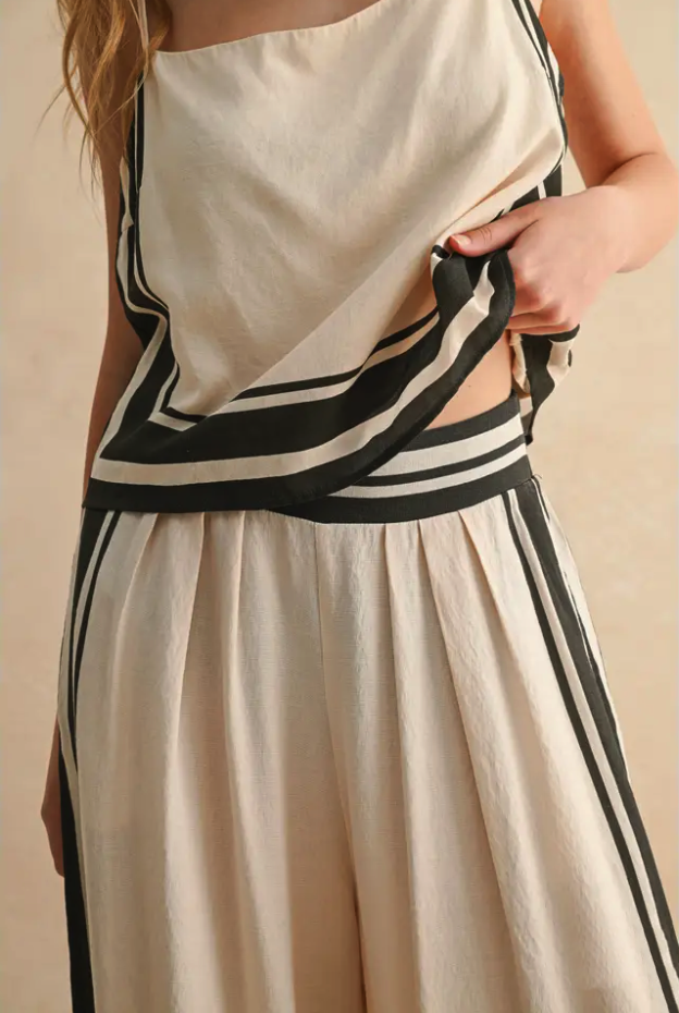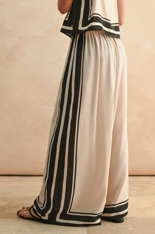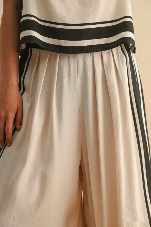 These pants are made to move with you—relaxed, refined, and endlessly wearable. The bold stripe detail turns a simple outfit into a statement, while the neutral tones offer maximum styling flexibility. Add a sleek sandal now and a cropped sweater later—it’s the kind of piece that carries you from warm afternoons to cool evenings with ease.