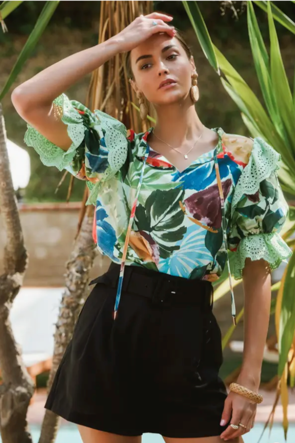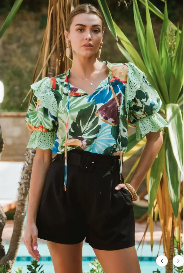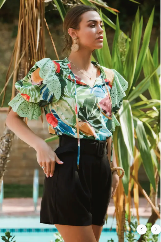 Whether you’re heading to brunch, a beachside dinner, or just running errands in style, this tropical blouse brings the sunshine. The cheerful colors and breezy silhouette make it an ideal go-to for summer fun, and the flirty details elevate even the most casual outfit. It’s a standout piece made for easy compliments and effortless outfits.